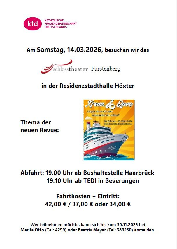 Es sind 2 Karten für je 42 € frei geworden. Wer mitfahren möchte, kann sich gerne bei Beatrix Meyer melden.